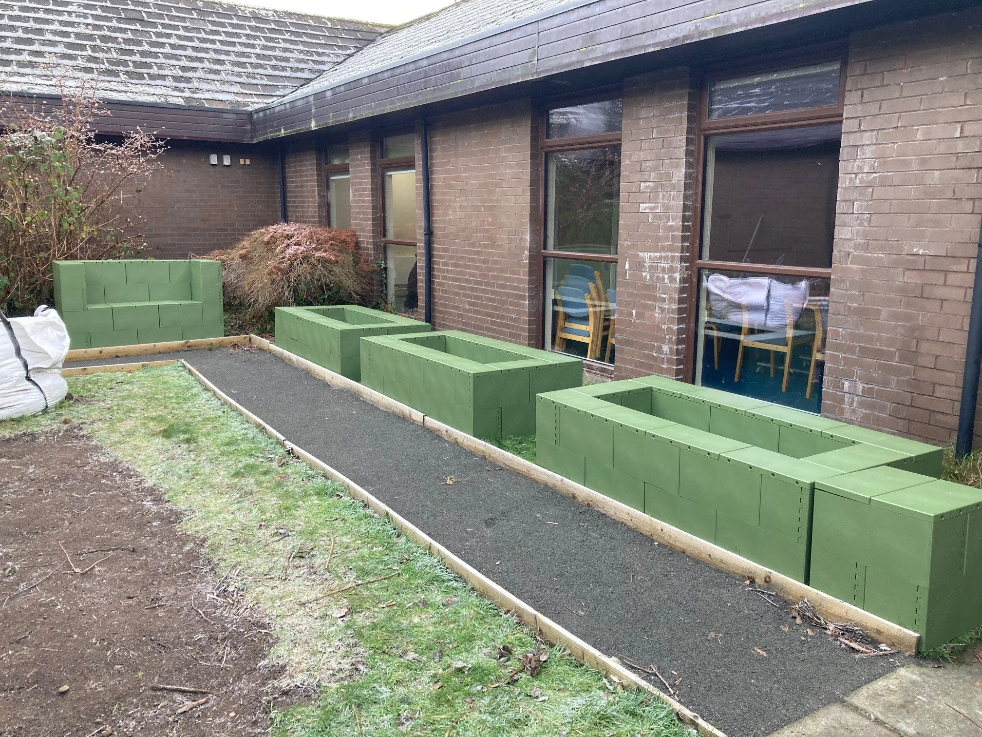 Another fortunate outcome from the open evening was an introduction to local company, Quickblock which led to a very generous donation of modular blocks, allowing us to build raised beds and a bench. The blocks are made from 100% recycled material and should last for up to 30 years. This donation freed up some of the budget to focus on making the garden more accessible.