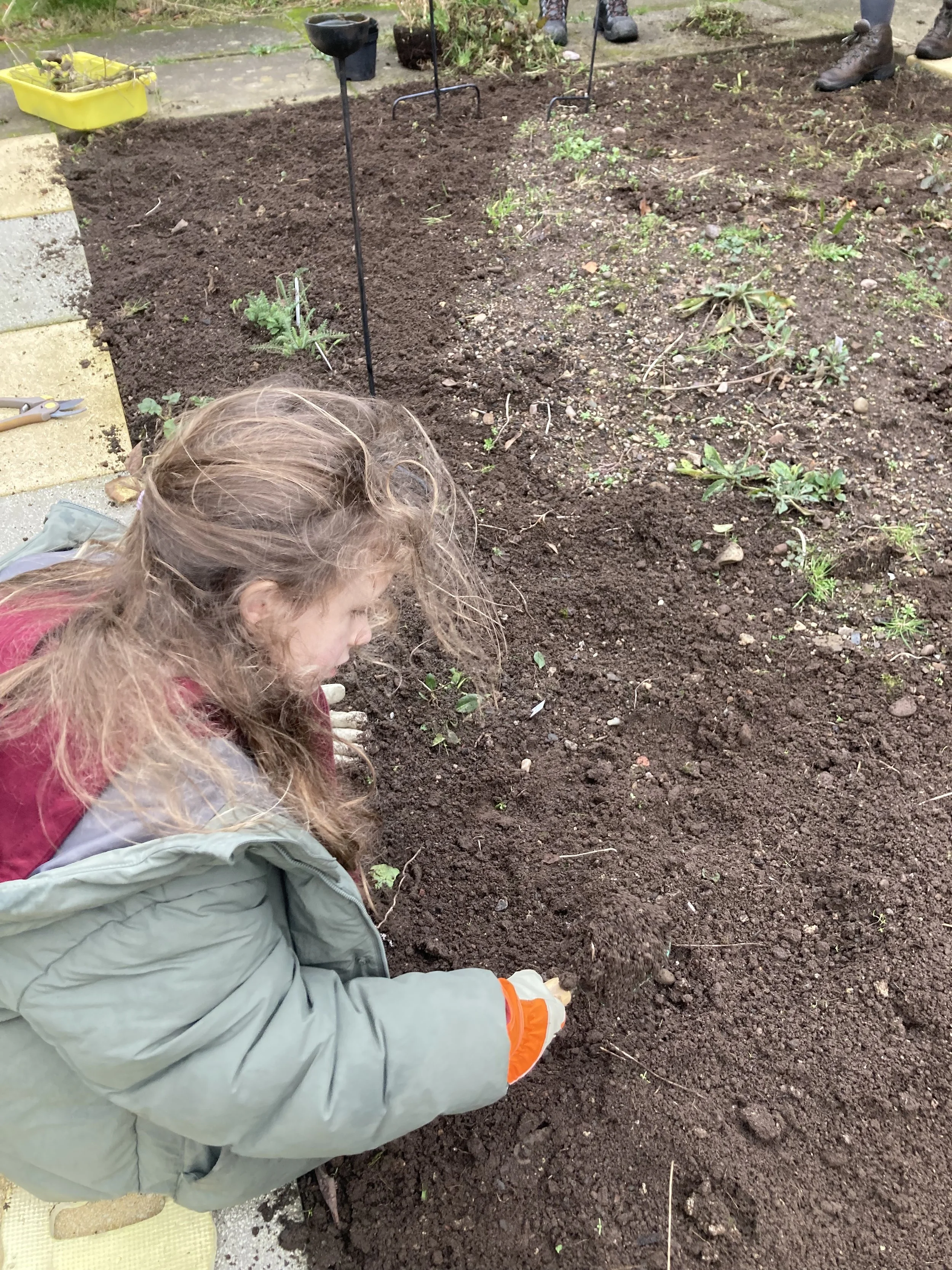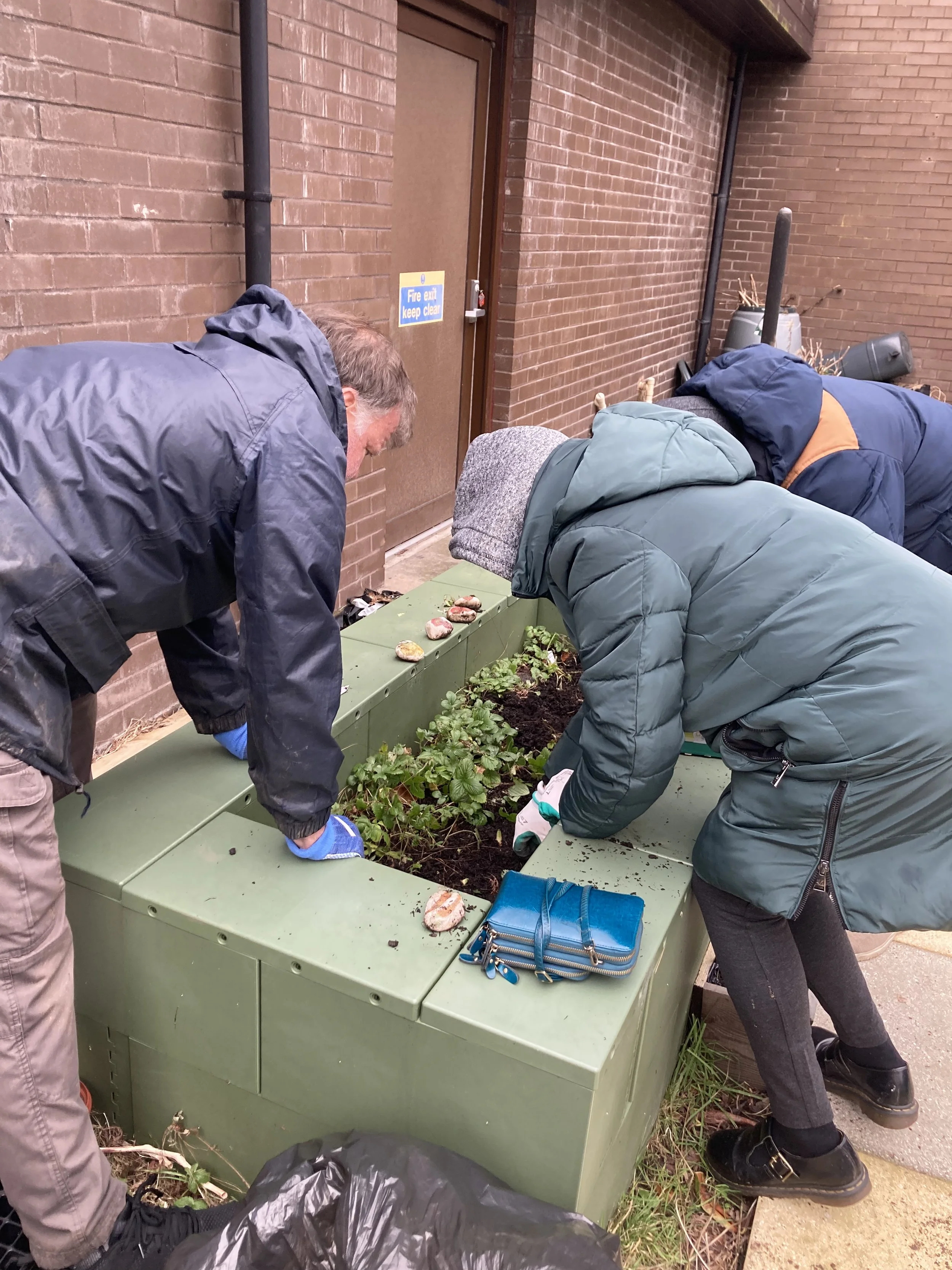Volunteers digging out the Quickblock raised beds to add in spring bulbs.
