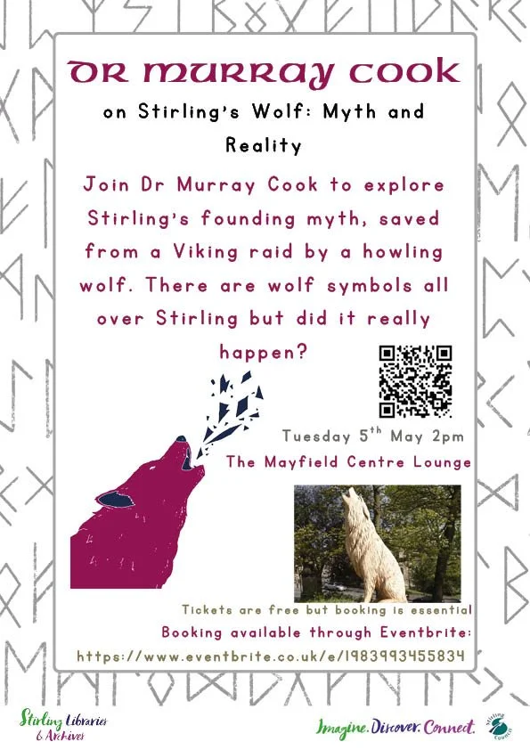 For those interested in the legend of the wolf, you can learn more at a free presentation by Dr Murray Cook in the Mayfield Centre on 5th May at 2pm. Tickets are bookable via the library desk or at Eventbrite: https://www.eventbrite.co.uk/e/dr-murray-cook-presents-stirlings-wolf-myth-and-reality-tickets-1983993455834?